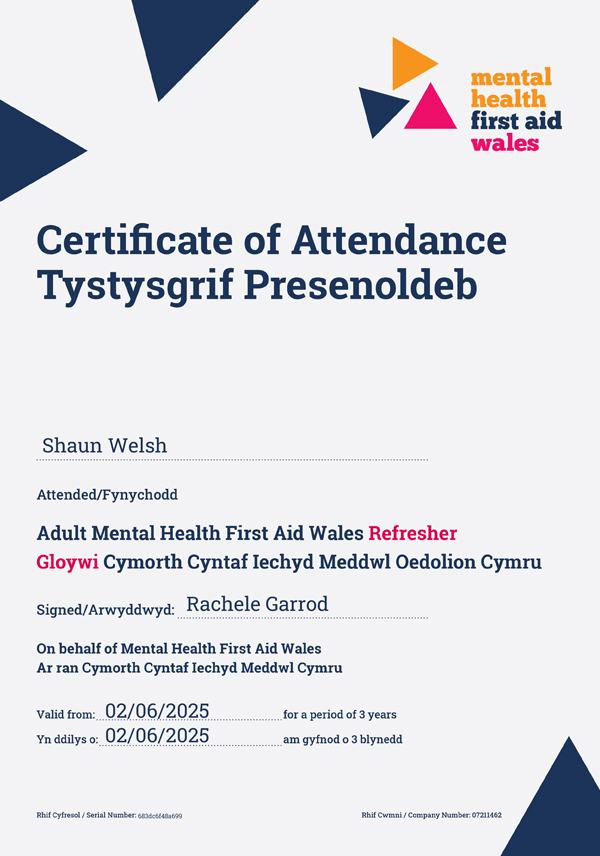 To strengthen this commitment, team members, including our commerical director Shaun Welsh, take part in regular mental‑health awareness courses, helping to promote understanding and reduce stigma throughout the workplace. Shaun’s ongoing involvement reflects our belief that learning about mental health is an essential, continuous effort.